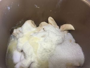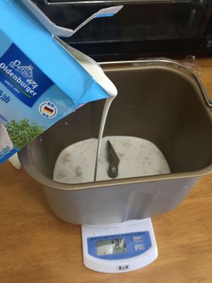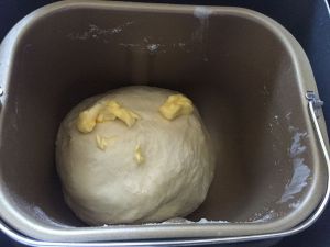 将中种材料里面的淡奶油、牛奶酵母混合液和蛋白、黄油混合放入面包桶内