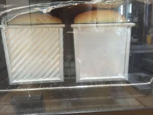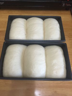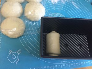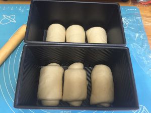 然后将6个面团全部操作好,分别放入两个土司盒中