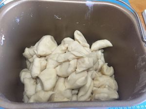 将面团拿出来之后用剪刀剪成小块,放入面包桶中