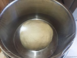 下面进入最后的发酵步骤了,我的方法是放入烤箱中不通电,放一盆热水,用热水的水蒸气闷着面团,这样温度湿度都可以保证。中途换一次水,因为现在这个天气水很容易凉