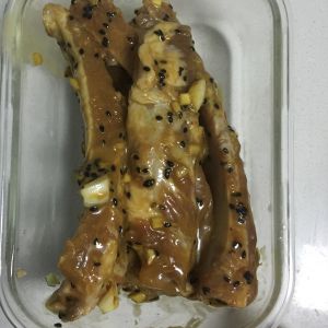 姜、蒜切碎,与酱油、盐、蚝油一起搅拌,撒两勺黑芝麻。将调好的调料淋在肋排上,多翻几次,调均匀;