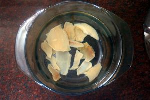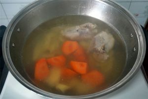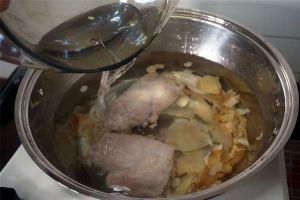 将猪展肉,响螺片,汤料包,姜块同放入锅里。