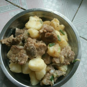 煮至排骨土豆熟透,加盐,生抽,味精,鸡精,葱。收汁出锅。