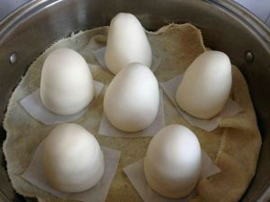 用双手在面团下部搓高,搓圆。下面垫上油纸,放入冷水的蒸锅中。醒发30分钟。