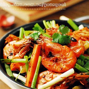 往做法(五)中放入胡萝卜、莴笋、芹菜,改中火,放入虾,翻炒均匀使所有料汁都附在虾上即可