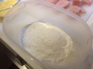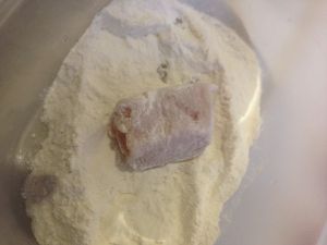 将鸡块充分和干粉接触 尽可能粘满干粉