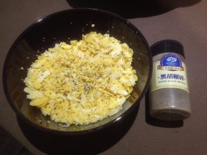 将打碎的玉米片和奶酪混合 在放入适量的黑胡椒提味