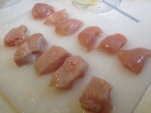 将鸡胸肉切成拇指粗小块 (不要切太大 不容易熟)