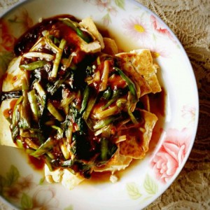 锅中倒少许油,油热后放半勺不辣的豆瓣酱,两勺耗油,小半碗水,至冒泡,加入韭菜段或香葱段,等韭菜熟了(变软),浇芡汁。最后将豆腐倒入锅内翻炒让酱汁包裹在豆腐上就完成啦!