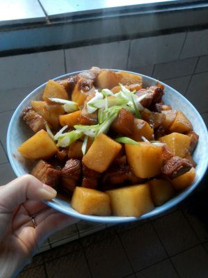 倒热水没过肉,放葱姜蒜,倒入土豆块,小火慢炖15-20分钟大火收汁,完成。