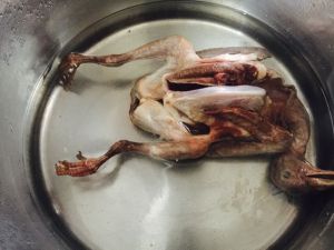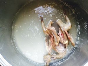乳鸽洗净,锅中放入冷水没过乳鸽。开大火。