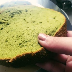 蛋糕冷却后分成两片,我把裂开的表面给切掉了,边角料也是可以吃的哈哈哈,虽然没有一般戚风爬得高但是还是软软弹弹的