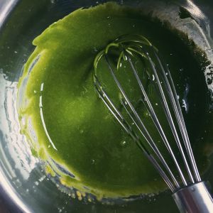 抹茶粉用温水泡开,搅拌均匀没有颗粒,我用的是宇治抹茶,因为喜欢吃抹茶所以放了不少,但是抹茶粉很容易结块,所以先用水泡好再加到蛋黄糊里去,不是先加水加油再加粉的