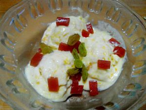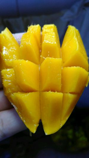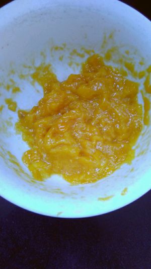 然后将芒果打成糊状(可以用机器打,但是我不建议,可以将保鲜膜裹在蒜锤上面锤,这样水分不会流失吃的时候还会吃到果肉,满满的惊喜哦)