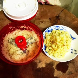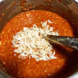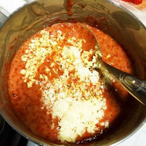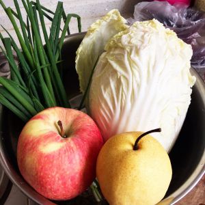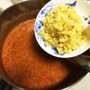 糯米粉炒熟,加入苹果汁和梨汁,搅拌均匀,根据自己的口味,加入辣椒粉、生姜、大蒜。