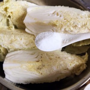大白菜洗干净、水控干后,把盐均匀的洒在每一片叶子上,腌8小时。