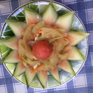 最后,把西瓜球放在中间,美味又健康的凉拌西瓜皮就完成了!