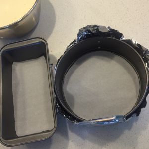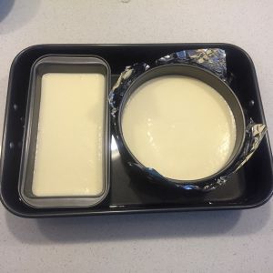 水浴法烘烤,因为圆形的是脱底蛋糕模,所以外面又包了锡纸,高度基本和模子平,在深烤盘里注入热水,高度不低于蛋糕模的一半,烤箱预热摄氏180度,烤10分钟,再调到摄氏150度烤35分钟