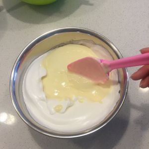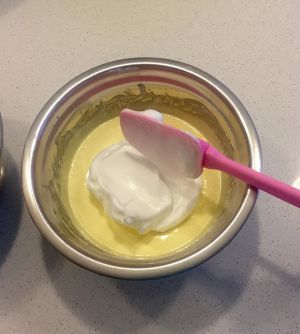 把1/3打发好的蛋清放入蛋黄面糊里,切拌均匀,千万不能打圈