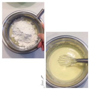 在蛋黄奶糊里筛入低筋粉和玉米淀粉,搅拌成均匀的面糊