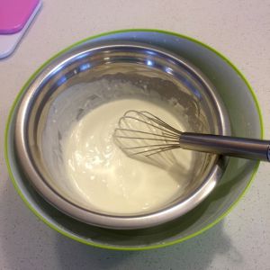 大盆里放些热水,小盆里放奶油奶酪,牛奶,黄油,搅拌成均匀细滑的糊