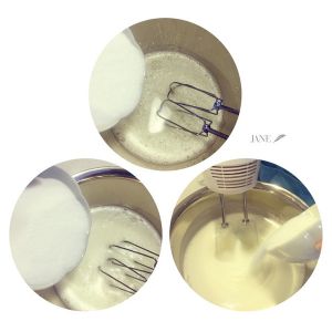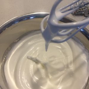 电动打蛋机打发蛋清,粗泡时加1/3糖,细泡时再加1/3,打出纹路时加入剩余白糖,继续打发