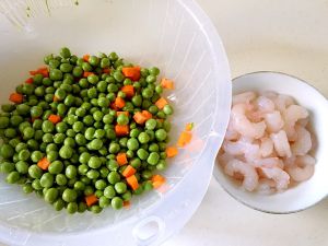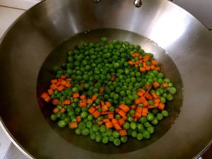 豌豆、胡萝卜下锅焯八成熟捞起,焯水之前记得滴几滴油、放点盐,这样豌豆焯好水之后也是碧绿的