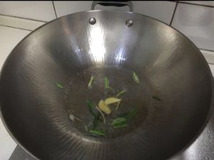 热锅冷油先将姜片、小葱下锅,爆香后可以将姜片、香葱捞出不要,再滑入虾仁翻炒,再下豌豆翻炒