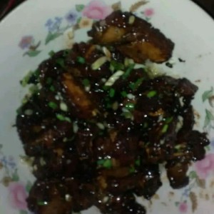 排骨熬好后可倒入配好的调料(注意,这时锅里必须有水,没有也可加入水),当水熬干后就盛入盘子里,撒上小葱,有芝麻的也可撒上