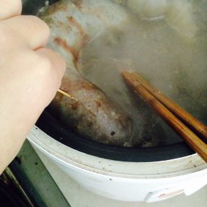 放多点水烧开,泡过大肠,水开煮十五分钟后用牙签在大肠排下水气。