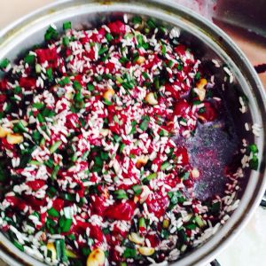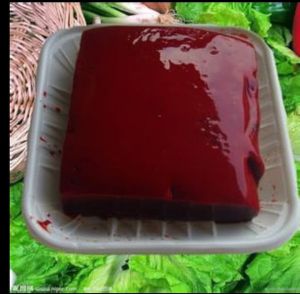 将所有配料混合(韭菜,花生,糯米,猪红)盐、油适量调味。