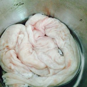 准备材料猪大肠,反过来洗干净,这可是要时间来慢慢洗,我加了盐还有白醋来洗,可以去味的,什么味,你懂的…