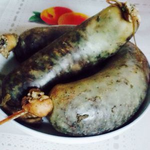 忘记拍酿好的图片了。用勺子将所有材料放进大肠内,从上往下推。就酿好形状了。再把另一头也封好打结。
