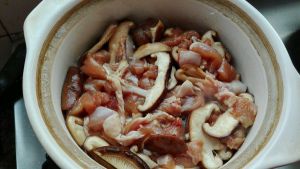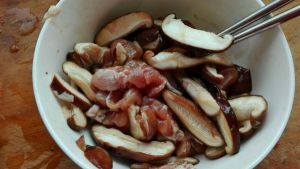 鸡腿去骨头,切小块,香菇切小块,加入盐、酱油、糖腌制
