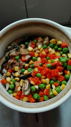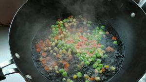等听见锅底有滋拉滋拉的声音时,加入豌豆玉米胡萝卜粒即可