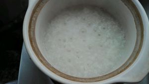 米洗净后,加水和几滴油,大火煮开后小火焖煮