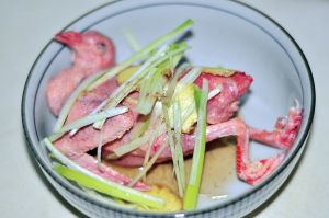 乳鸽用姜片、葱丝、胡椒粉、盐、料酒码匀腌50分钟入味。