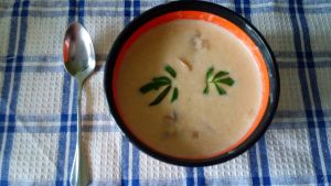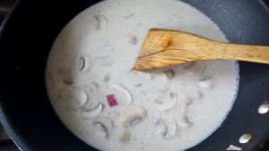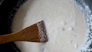 淡奶油烧开后,倒入清水面糊。慢火熬煮,不停翻动。感觉汤变浓稠,加入适量盐、胡椒粉。关火。