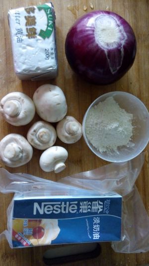准备好所有材料。口蘑洗净切片,据个人喜好和口蘑大小放5~10个。紫洋葱去皮切碎块。