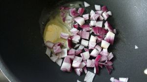 炒锅放适量黄油(多点儿少点儿问题不大)融化,先倒入洋葱碎翻炒,再加入口蘑片炒,最后加入黑胡椒碎继续翻炒。洋葱炒软后加一半的水,炒开,全程中火。