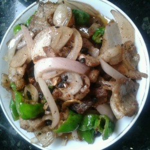 这时锅里有炒肉下的油,倒出一部分,再往锅里放入姜蒜末和豆豉一起翻炒,看见豆鼓炒得有点变干,就把肉和青椒,洋葱,葱段加点盐一起下锅翻炒。(盐别放多了,豆鼓本就咸 ,适量放点就行^0^)