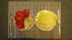 鸡蛋饼:鸡蛋三个打散,普通面粉2-3勺筛入,我比较懒,直接拿打蛋器打匀,加入少许盐。放在平底锅煎就好了。