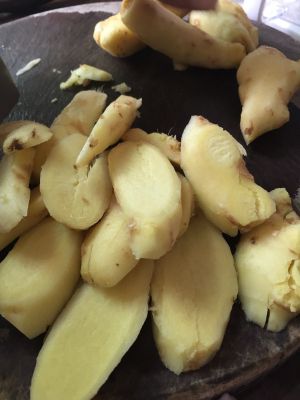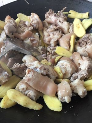 将姜片和猪脚一起炒至金黄,无需加油,加两勺盐。炒至水干,再放入锅中