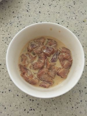 里脊肉加入少量生抽,料酒,盐,腌制二十分钟,加入适量的淀粉,将肉裹上淀粉后备用。