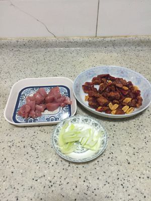 里脊肉切成小块,葱切丝,辣椒脆是买的成品,推荐陈大妈这个牌子,味道好。
