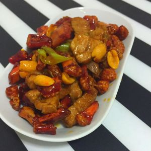 锅中加入少量油,加入葱花、白胡椒粉,炒出香味后加入辣椒脆,再加入料酒、里脊肉,翻炒,最后加入少量盐和鸡精,翻炒均匀出锅。