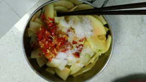 挤出瓜片的水,倒掉。加入大蒜、红辣椒、白糖。