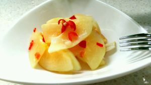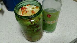 装入干净的大玻璃瓶,倒入米醋,让木瓜完全淹没在醋里,拧紧瓶盖,放阴凉处腌制1个晚上。