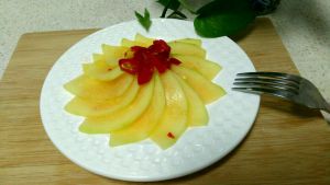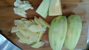 木瓜削皮,去籽,切薄片,大蒜米也切成片。
