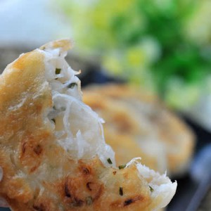 白萝卜去皮刨成细丝,葱洗净切成葱花,萝卜丝、葱花、盐、鸡精拌匀。面粉加清水调成稀面糊。